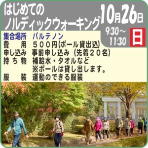 2025年10月26日 @ 9:30 AM – 11:30 AM – ノルディックウオーキングは、年齢を問わず楽しめます。 ポールを使うことで歩行姿勢が正され、転倒防止・腰痛軽減等 […]