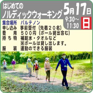 続きを読む2025年10月26日 @ 9:30 AM – 11:30 AM – ノルディックウオーキングは、年齢を問わず楽しめます。 ポールを使うことで歩行姿勢が正され、転倒防止・腰痛軽減等 […]