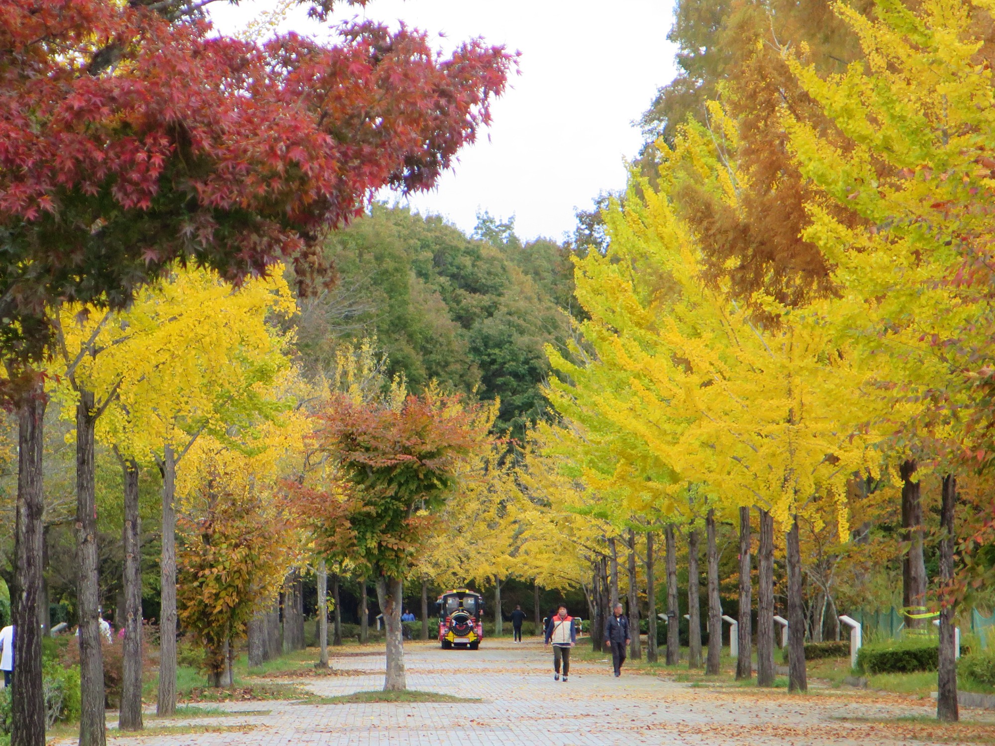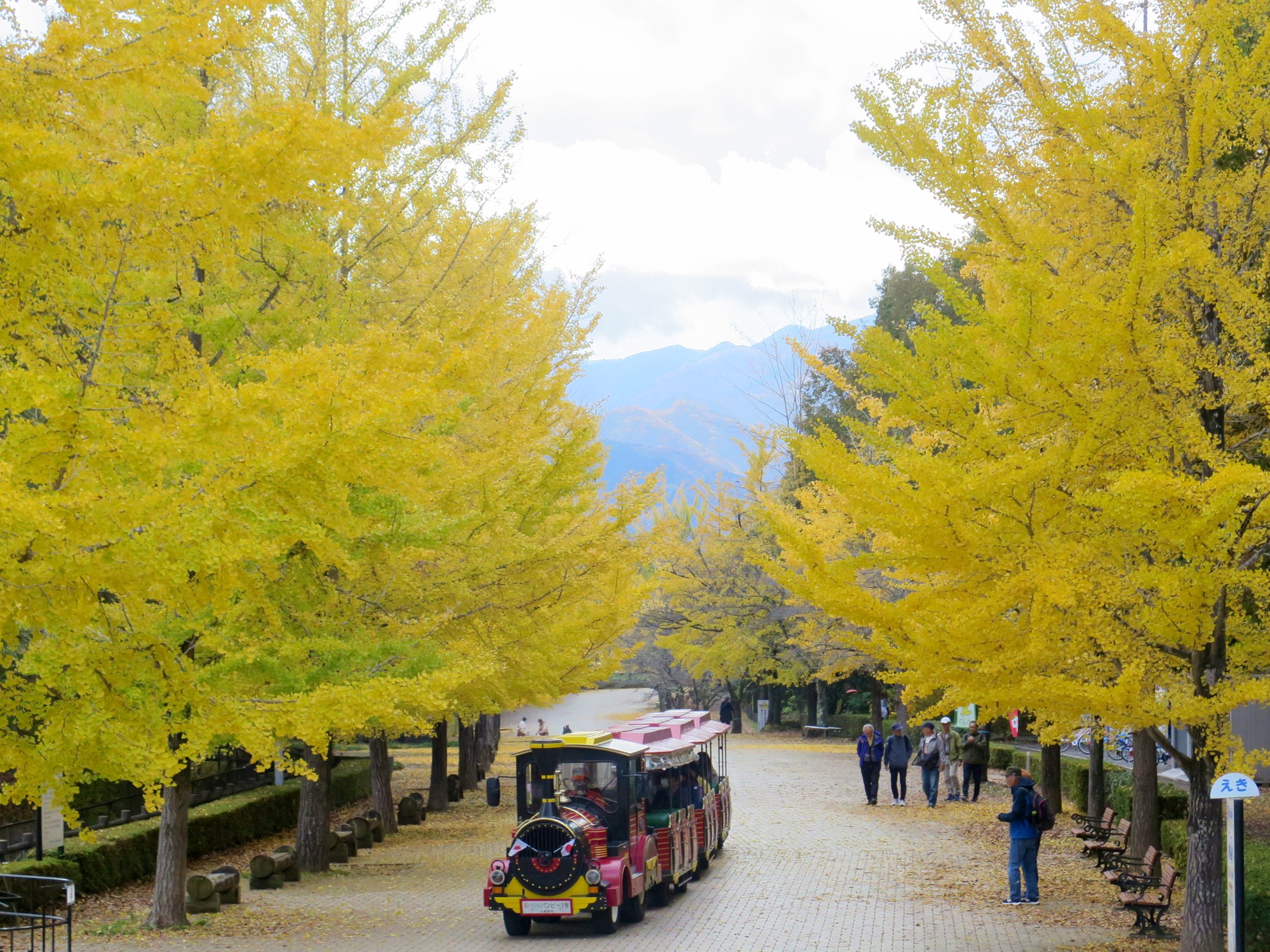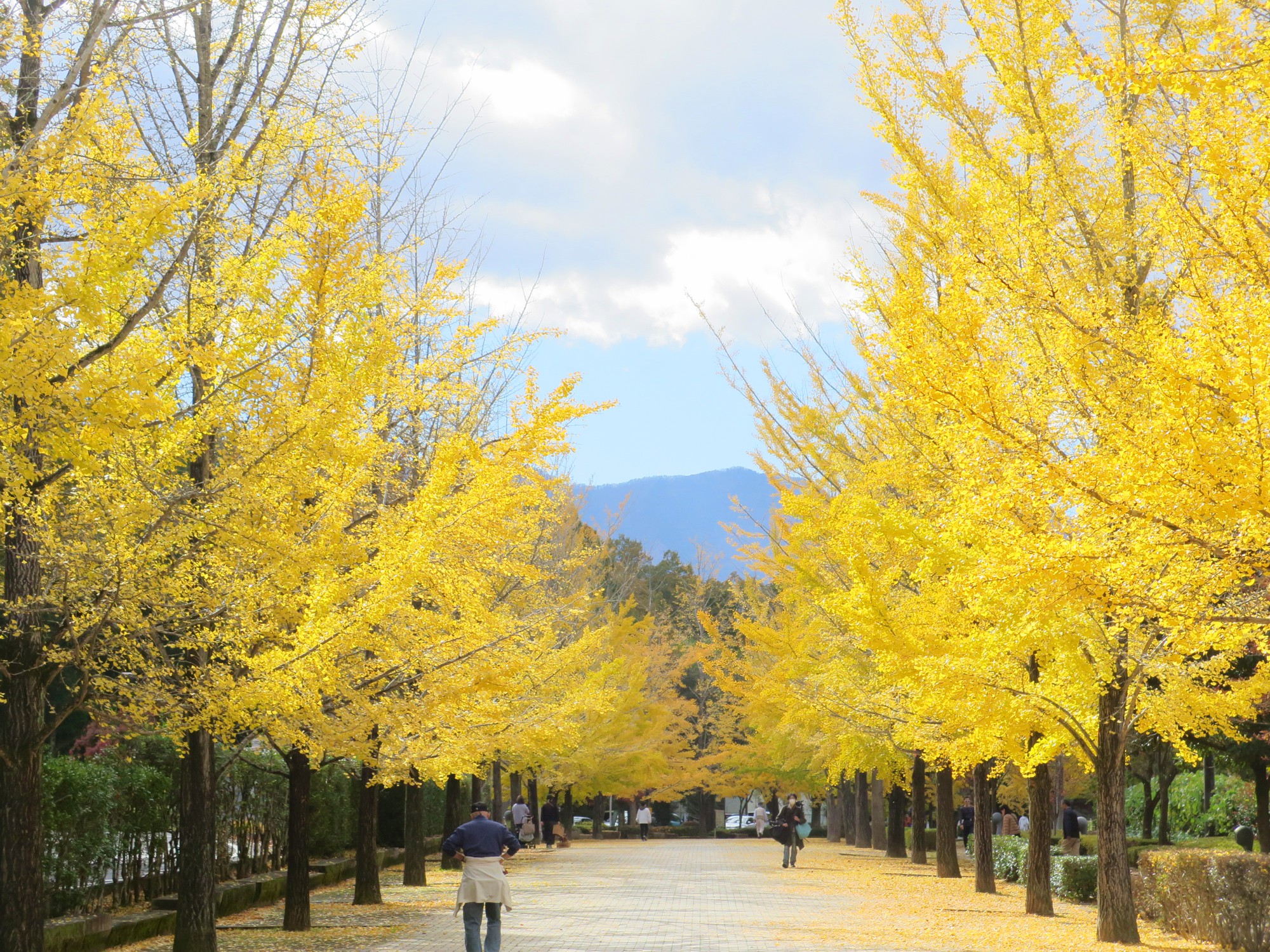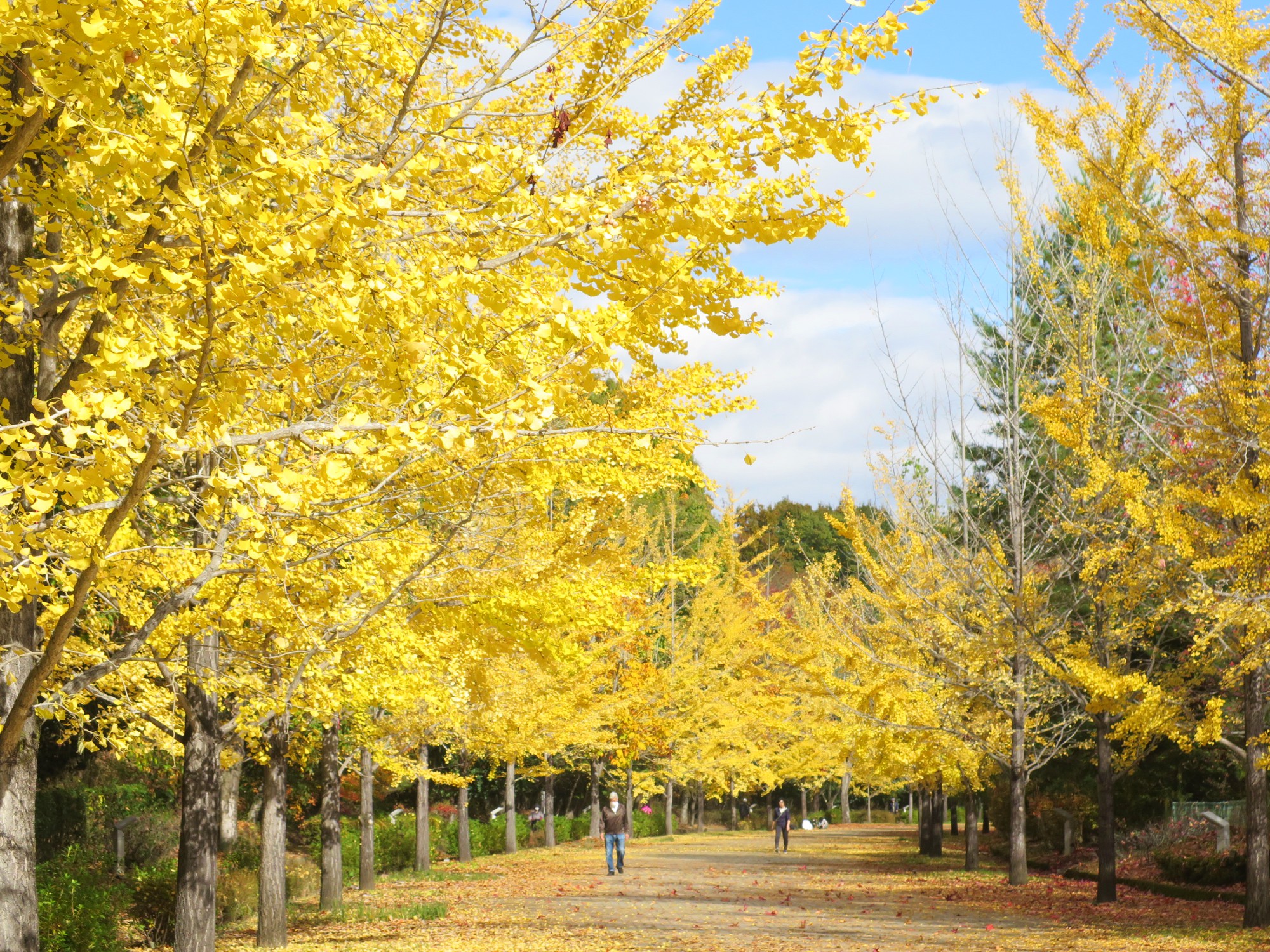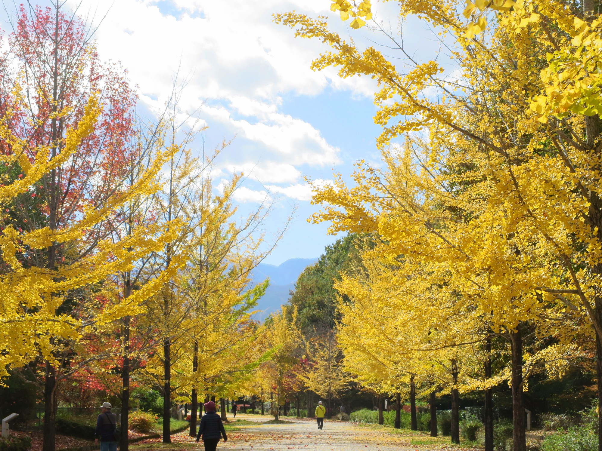 秩父ミューズパークのシンボルであるイチョウ並木(スカイロード)は、約3kmにわたる500本のイチョウの木は、前回よりも格段に色づきが進み、並木全体が太陽を浴びてまばゆい「黄金色のトンネル」へと変貌しています。