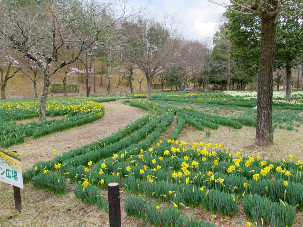 林間広場の南側約1,700㎡にスイセンの球根を約60,000球植栽しました。広場内には木片を敷き詰めた散策道が設けられ、スイセンのお花畑の中を散策できます。見頃は今月末から中旬を予定しています。